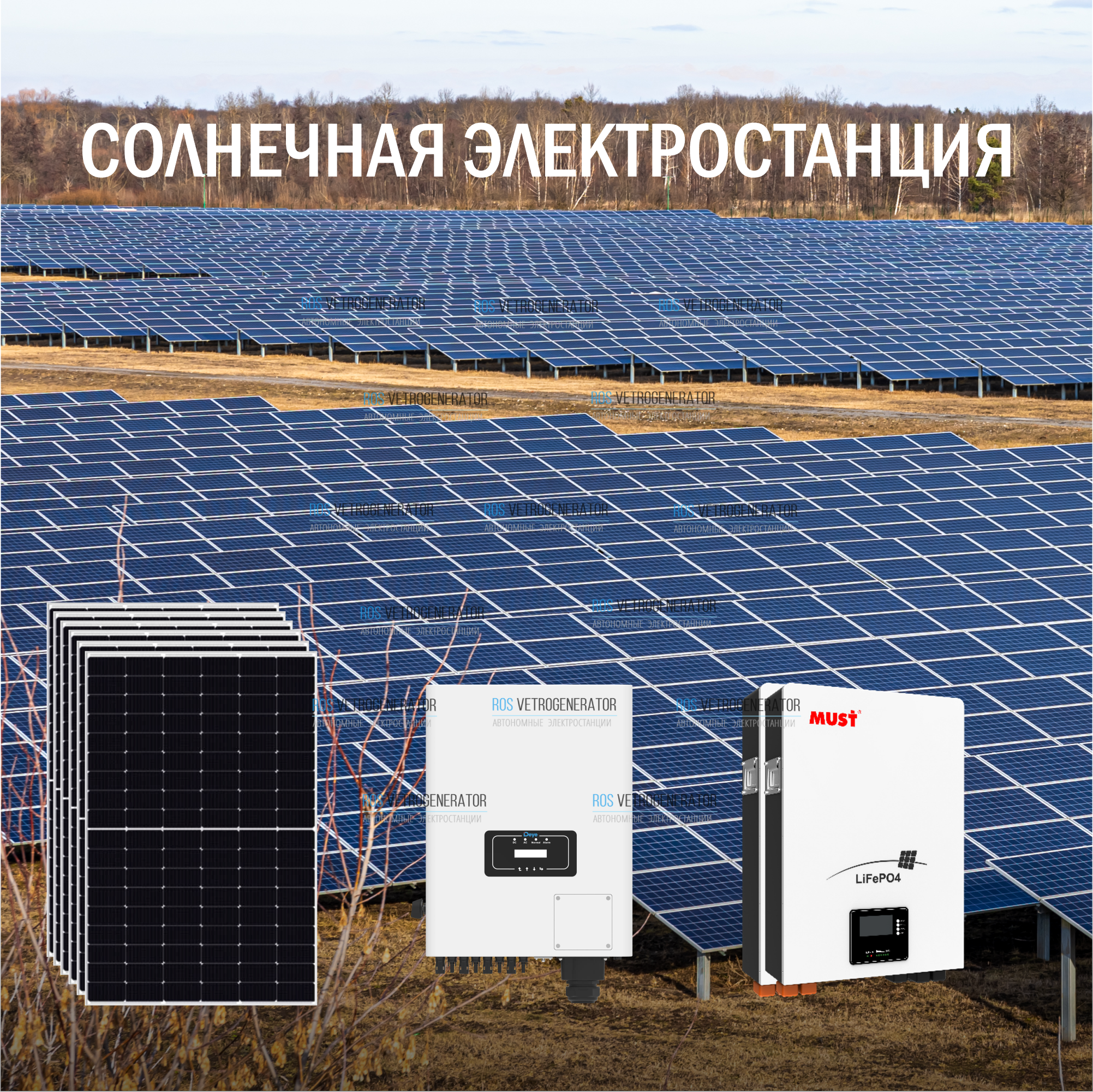 Комплектация | Солнечные панели, гибридный инвертор, аккумулятор |